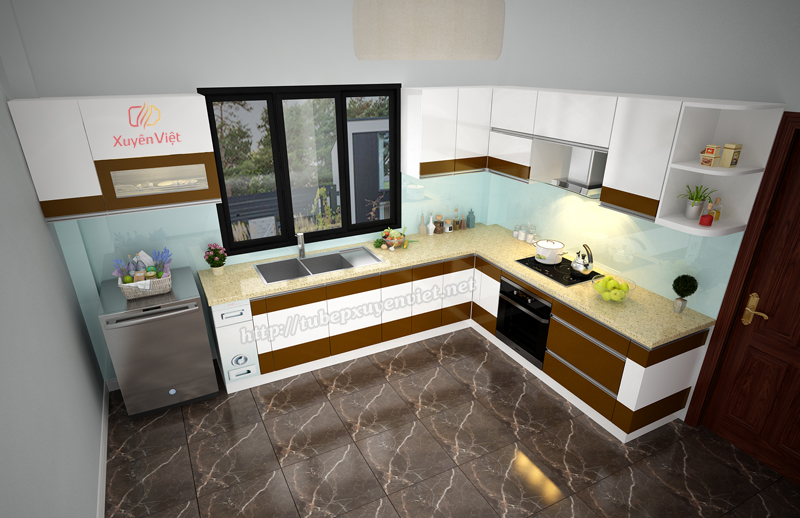 Toàn bộ tủ bếp trên được làm bằng nhựa pvc foam, tủ bếp dưới chạy hệ khung xương bằng nhựa ốp che hết phần khung ốp gạch 10cm đảm bảo hệ đồng bộ từ dưới lên trên rất hiện đại
