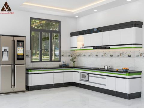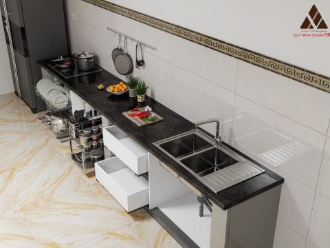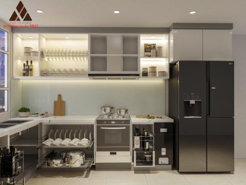 | Phụ kiện đi kèm | Bản lề giảm chấn, ray trượt bi 3 tầng, tay nắm (tùy chọn chất liệu và kiểu dáng), giá bát đĩa, giá xoong nồi, thùng gạo âm tủ, thùng rác thông minh… (Các phụ kiện này có thể tùy chọn theo nhu cầu và sở thích của khách hàng). |