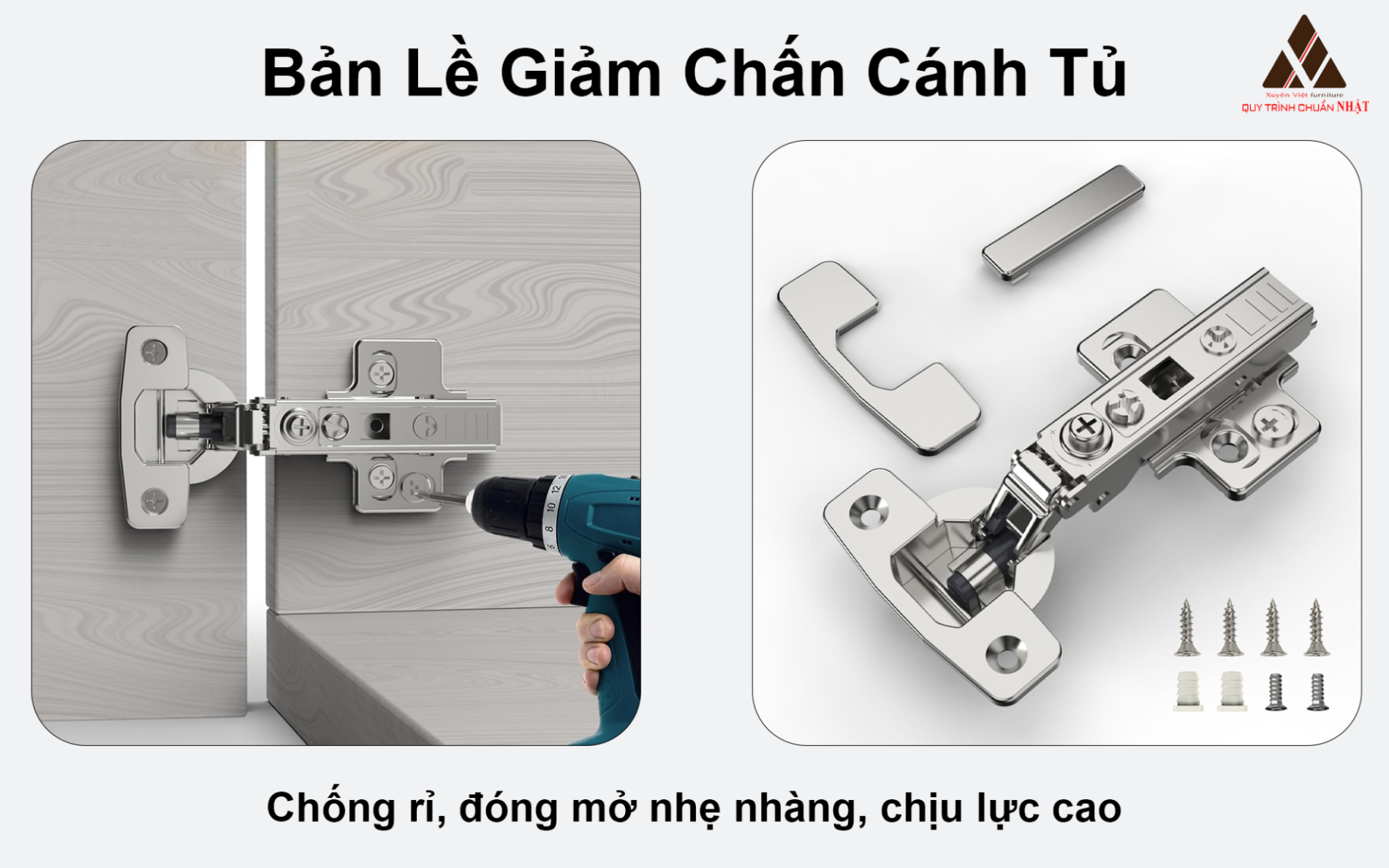 - Bản lề: Nên chọn bản lề giảm chấn, làm từ inox 304 không gỉ, giúp đóng mở cánh tủ êm ái, nhẹ nhàng.