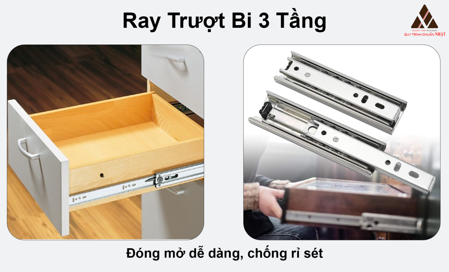 - Ray trượt: Sử dụng ray trượt bi 3 tầng, có khả năng chịu tải trọng lớn, giúp kéo mở ngăn kéo dễ dàng, không gây tiếng ồn.