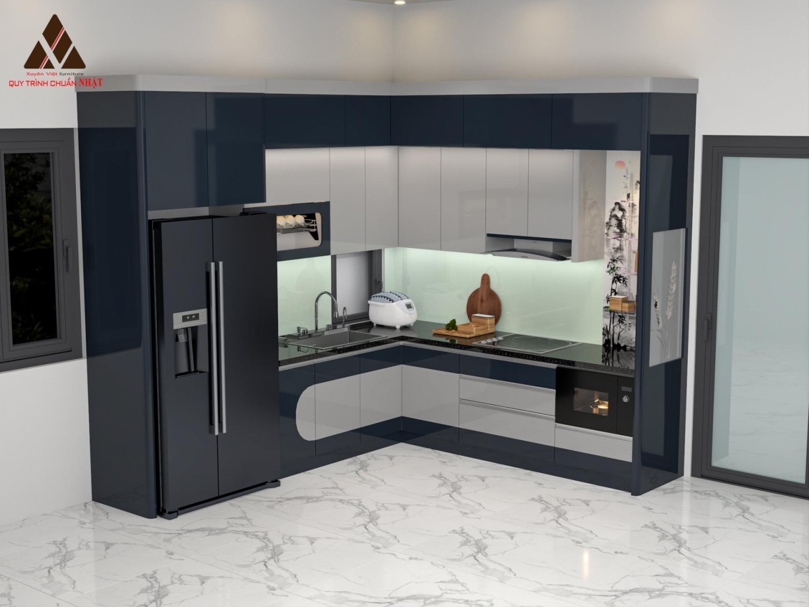 Công nghệ hiện đại Xuyên Việt có thể sử dụng 2-3 line màu hoặc tạo đường cong ấn tượng trên cánh tủ, từ đó tôn lên vẻ đẹp của không gian bếp, làm cho căn phòng trở nên sống động và thu hút mọi ánh nhìn.