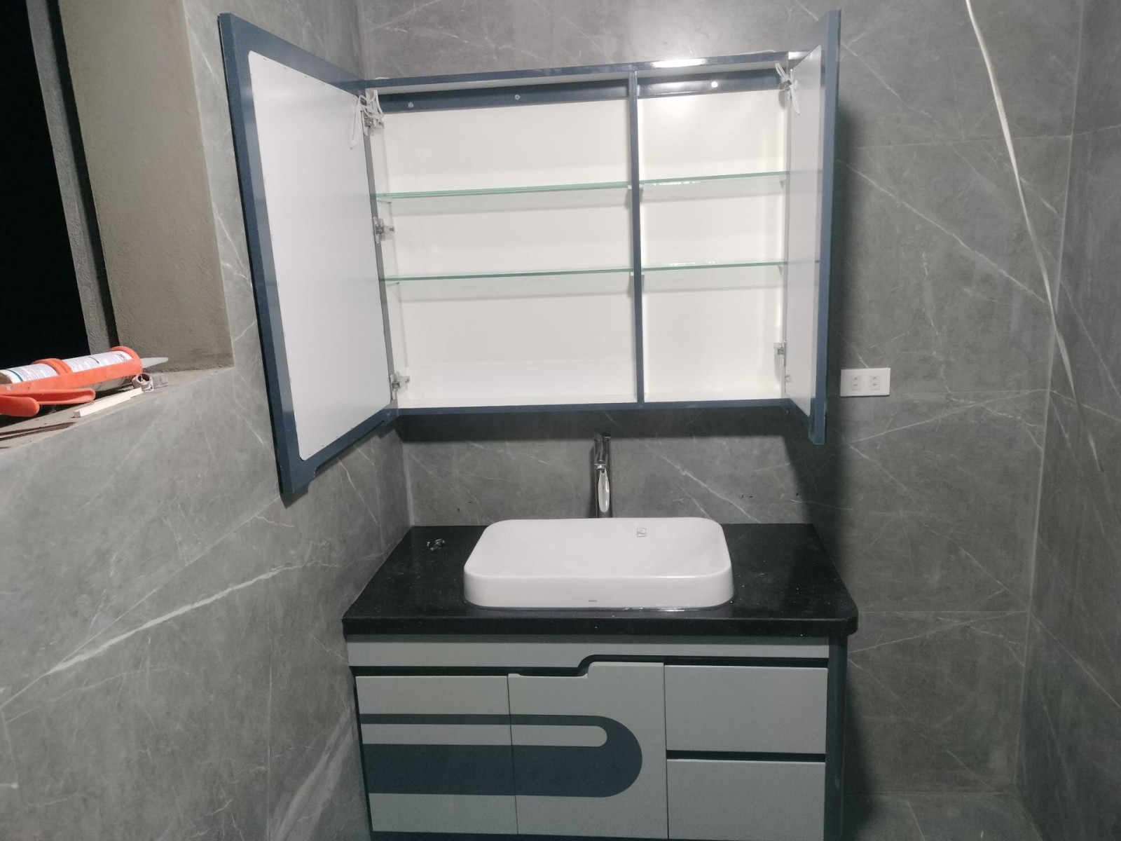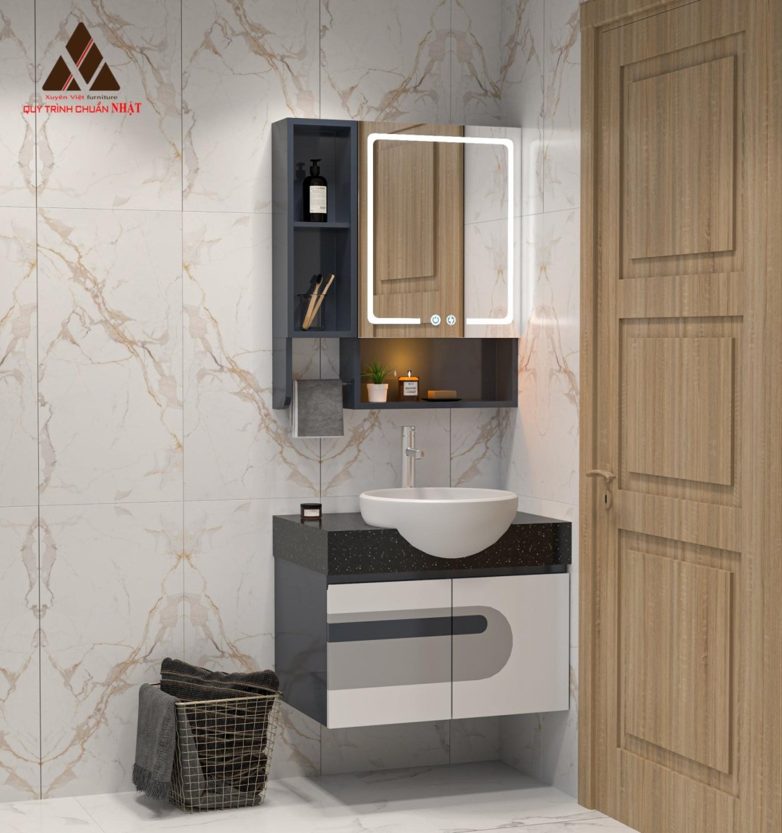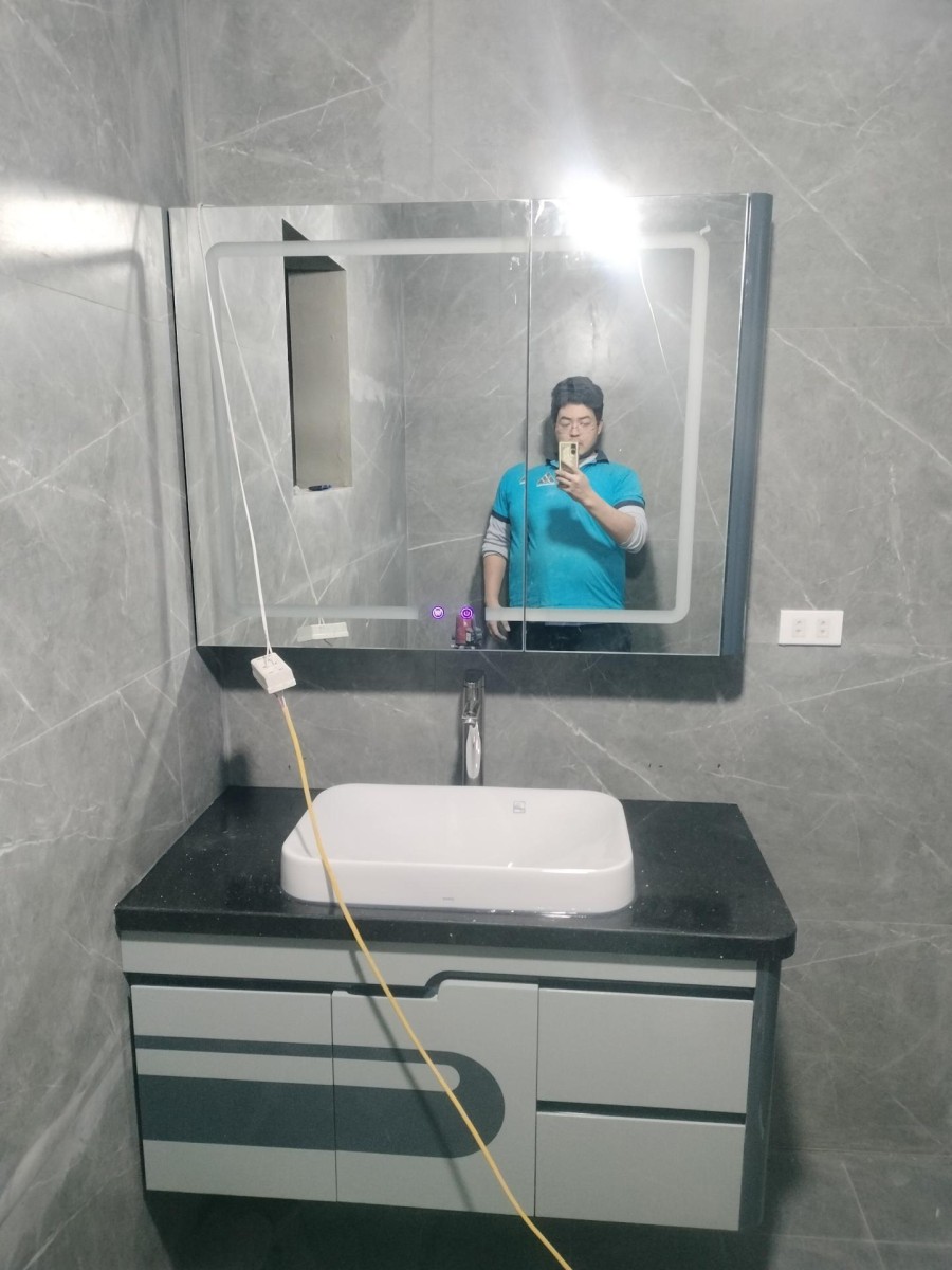 Tủ lavabo nhà anh Thành được thiết kế dạng treo tường giúp tiết kiệm không gian nhà vệ sinh. Phía trên tủ được trang bị một chiếc gương soi cỡ lớn tích hợp đèn led cực kỳ thẩm mỹ và thời gian. Tủ lavabo còn được thiết kế kệ để đồ thời trang giúp gia đình anh Thành lưu trữ vật dụng và trưng bày các vật trang trí thu hút ánh nhìn.